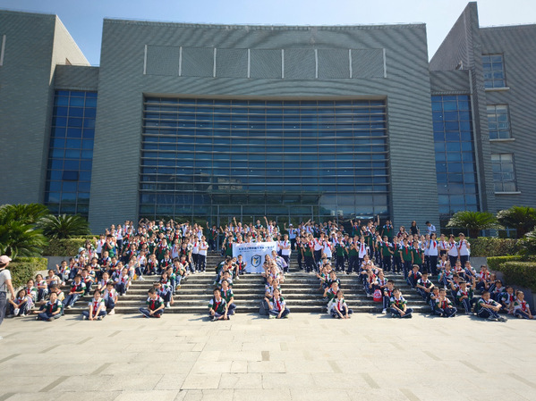 参加研学活动的240余名同济附校学生在嘉定校区济人楼前合影
