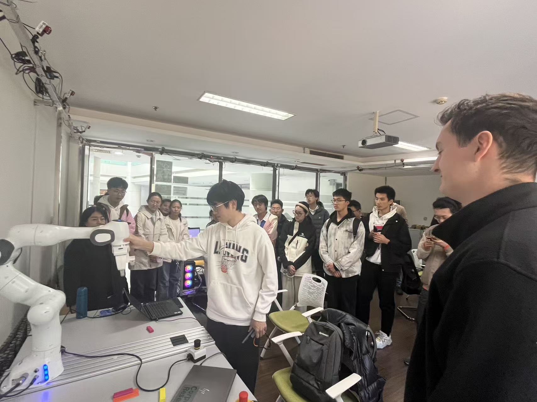 “在课本上读到‘人工智能’,远不如亲眼见证机器人完成一系列复杂指令来得震撼!”一位新生在参观后兴奋地表示。在济人楼的机械臂实验室,同学们见到了控制频率高达1kHz的高性能机械臂,它能快速响应力控调节,并兼容ROS2、MATLAB等开发工具,现场演示了适配具身智能机器人算法与AI视觉的先进控制场景。在华楼的VEX机器人实验室,气氛也非常热烈。机器人的精准得分操作、流畅的自动程序以及紧张刺激的对抗赛,生动诠释了机器人技术的竞技魅力与工程实践乐趣。