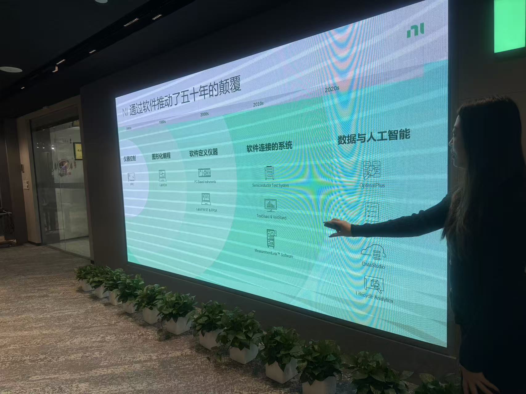活动开始后,讲解员首先为同学们介绍了NI公司的发展历程。这家公司创立于1976年,最初只是车库里的一个小团队,如今已成长为全球知名的行业领导者。其发展历程始终专注于技术创新。近年来,NI被世界500强企业艾默生收购,在保留自身创新活力的同时,也获得了更强大的全球资源支持,从而能够更快地推进技术发展。